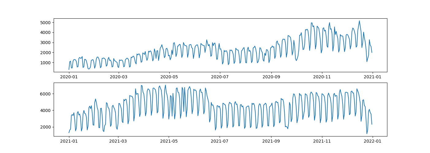 우선 아래와 같이 2020년 일별 페이지뷰 그래프와 2021년 일별 페이지뷰 그래프가 두 개의 서브플롯으로 잘 그려졌습니다.