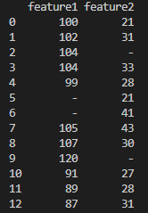 다음과 같은 엑셀 파일이 있다고 가정하겠습니다. 누락된 데이터는 -으로 표기되어 있습니다.