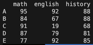 df = pd.DataFrame([[95, 92, 88], [84, 67, 88], [91, 99, 68], [87, 79, 81], [77, 92, 85]],