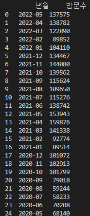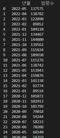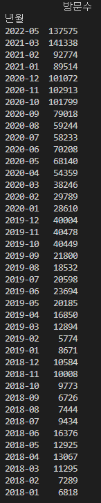 아래와 같이 생긴 년월, 방문수라는 두 개의 컬럼을 가진 데이터프레임이 있다고 가정하겠습니다. 0, 1, 2, 3과 같은 정수형 위치 인덱스가 사용되고 있는 데이터프레임입니다.