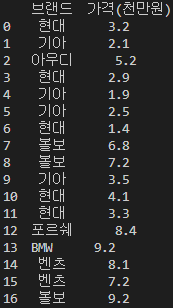 data = {'브랜드':['현대', '기아', '아우디', '현대', '기아', '기아', '현대', '볼보', '볼보', '기아', '현대', '현대', '포르쉐', 'BMW', '벤츠', '벤츠', '볼보'],