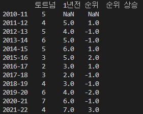 "1년전 순위" 컬럼에서 현재 순위 컬럼인 "토트넘"을 빼주면 토트넘의 전년 대비 순위 상승을 쉽게 구할 수 있습니다.