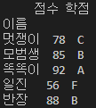 dict_data = {'이름':['멋쟁이', '모범생', '똑똑이', '일진', '반장'], '점수':[78, 85, 92, 56, 88]}