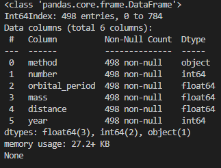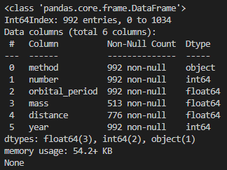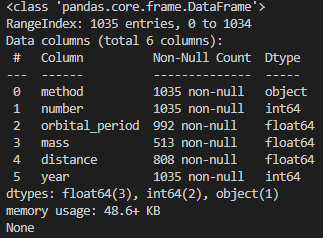 총 1305개의 행과 6개의 컬럼으로 이뤄진 데이터셋이고, method, number, year 컬럼은 결측치가 없습니다. 반면 orbital_period, mass, distance 컬럼은 결측치가 있는 상황입니다.