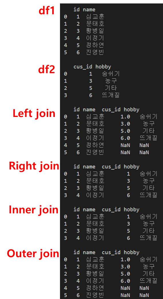 df2 = pd.DataFrame({'cus_id':[1, 3, 5, 6], 'hobby':['숨쉬기', '농구', '기타', '뜨개질']})