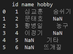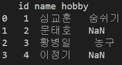 df2 = pd.DataFrame({'id':[1, 3, 5, 6], 'hobby':['숨쉬기', '농구', '기타', '뜨개질']})