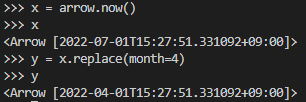 날짜 및 시간 정보를 바꿀 때는 replace 메소드를 활용하면 됩니다. 현재 일시에서 월 정보를 4로 바꿔보겠습니다.