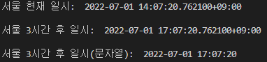 print("서울 3시간 후 일시(문자열): ", now_plus_3hours_str, '\n')