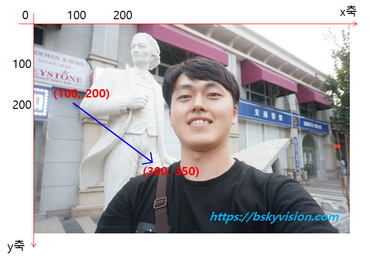 파란색의 화살표 있는 선이 잘 그려졌죠? 여기서 주의해야 할 것은 출발좌표와 종료좌표입니다. 출발좌표, 종료좌표는 (x, y)로 x축, y축을 그려놓고 생각하면 됩니다.