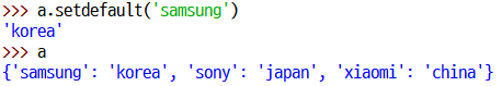 setdefault() 메소드에 'samsung'이라는 키를 첫번째 파라미터로 주면 어떻게 될까요?