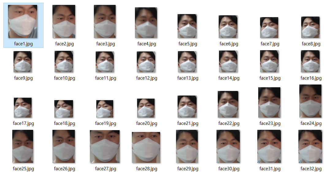 웹캠을 이용해서 촬영되는 영상에 얼굴 검출기를 적용해서 얻은 얼굴들을 잘라서 저장합니다. 한 번은 마스크를 착용한 채 촬영하고, 한 번은 마스크를 미착용한 상태로 촬영합니다. 마스크를 착용한 상태에서 얻은 얼굴 이미지들은 ./mask 디렉토리에 저장하고, 마스크 미착용 얼굴 이미지들은 ./nomask 디렉토리에 저장합니다. 모든 프레임의 영상을 다루면, 얼굴 이미지에 큰 차이가 없기 때문에 저는 8장마다 한 장의 프레임을 선택해서 얼굴 이미지들을 저장했습니다.