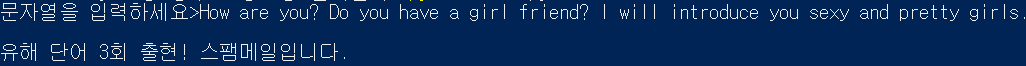 첫번째 문자열의 경우 위험 단어인 girl, sexy, girls가 각각 한번씩 출현했습니다. 총 3개의 유해 단어가 감지되었기 때문에 스팸메일로 분류되었습니다. 반면 두번째 문자열에는 단 하나의 유해 단어도 발견되지 않았기 때문에 스팸메일로 구분하지 않았습니다.