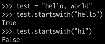 "hello, world"는 "hello"로 시작하기 때문에 test.startswith("hello")는 True를 반환하고, "hi"로 시작하지 않기 때문에 test.startswith("hi")는 False를 반환합니다.