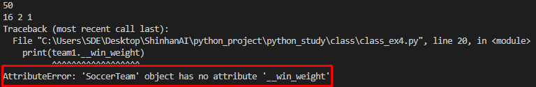 다른 공개 속성과는 달리 클래스 외부에서 접근하고자 하면 에러가 발생합니다.