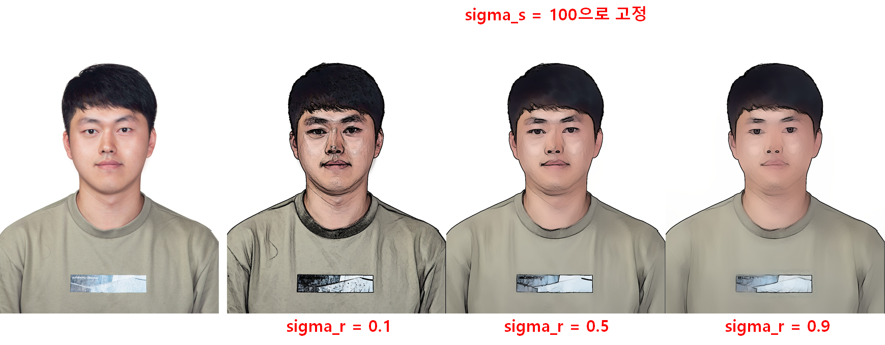 이때 사용자가 조정가능한 두 개의 파라미터가 있습니다. 하나는 sigma_s라는 것이고, 다른 하나는 sigma_r이라는 것입니다. sigma_s는 이미지가 얼마나 스무스해질지를 결정해줍니다. 클수록 이미지가 더 스무스해집니다. 0에서 200까지의 값이 입력 가능합니다. sigma_r은 이미지가 스무스해지는 동안 엣지를 얼마만큼 보존시킬지를 결정해줍니다. 작을 수록 엣지가 많이 보존됩니다. 0에서 1까지 입력 가능합니다.