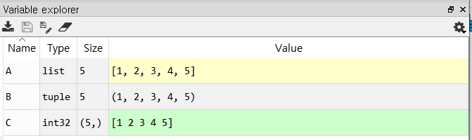 변수의 이름이 무엇인지, 어떤 자료형의 변수인지, 크기가 어떤지, 어떤 값들이 들어가 있는지를 한 눈에 보여줍니다.