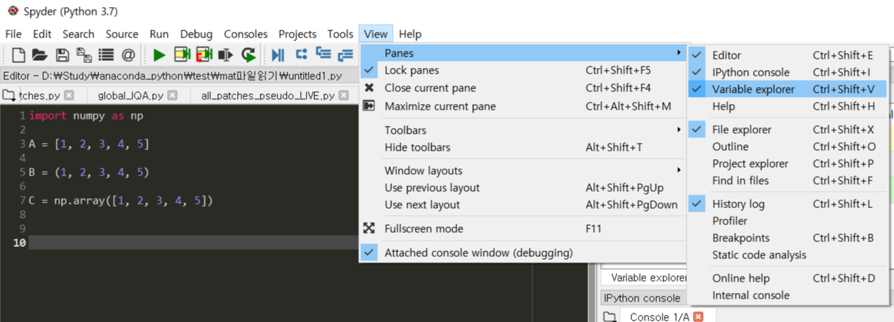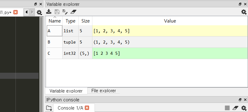 아나콘다에서 제공하는 파이썬 통합개발환경(IDE)인 스파이더(spyder)의 큰 장점 중 하나는 변수탐색기(variable explorer)를 지원한다는 점입니다. 변수탐색기는 이름, 사이즈, 자료형, 값 등 변수에 대한 중요한 정보들을 보여주기 때문에 개발을 하는데 큰 도움을 줍니다. 다음과 같이 코딩한 후에 실행해보면, 변수탐색기가 생성된 변수들에 대한 정보를 보여줍니다.