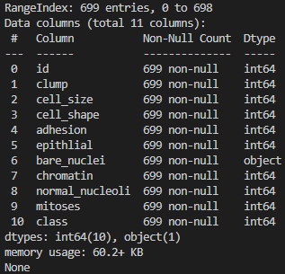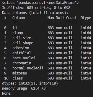 df.columns = ['id', 'clump', 'cell_size', 'cell_shape', 'adhesion', 'epithlial', 'bare_nuclei', 'chromatin', 'normal_nucleoli', 'mitoses', 'class']