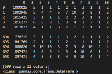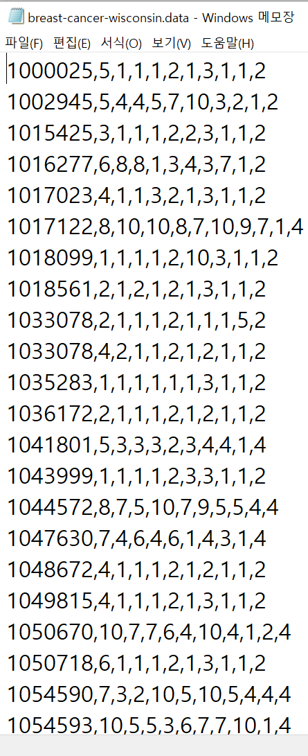 유방암 데이터셋은 csv 파일로 제공되는데 다음과 같이 699개의 행, 11개의 컬럼으로 구성되어 있습니다.