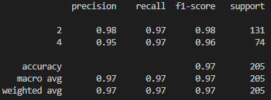 confusion matrix를 보니 양성(2)을 양성(2)으로 잘 예측한 케이스가 127건이고, 양성(2)을 악성(4)으로 잘못 예측한 케이스가 4건이고, 악성을 양성으로 잘못 예측한 케이스가 2건이고, 악성을 악성으로 잘 예측한 케이스가 72건입니다. 양성을 예측하는 기준으로 f1 점수는 0.98이고, 악성을 예측하는 기준으로는 f1 점수가 0.96이네요. 현재 이 모델은 매우 높은 성능을 보인다고 볼 수 있습니다.