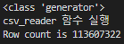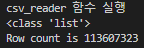 위 코드를 실행하면 다음과 같이 함수 내부에 있는 print 문을 통해서 "csv_reader 함수 실행"이라는 문구가 터미널에 출력되고, 행 개수도 잘 계산해냅니다. 일단 우리가 원하는 기능은 수행해냈습니다.