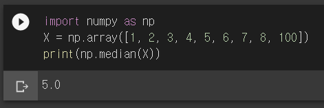 중앙값으로 5가 나왔죠? 참고로 numpy 패키지를 import 할 때 np라는 이름으로 부르기로 했기 때문에, numpy.median()을 np.median()과 같이 사용할 수 있는 것입니다.