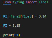 파이썬의 타입 힌트는 절대 타입을 강제하는 것은 아니기 때문에 상수로 타입 힌트를 준 PI에 다른 값으로 재할당하는 것이 가능하긴 합니다. 하지만 Final로 타입 힌트를 주면 IDE에서 보시는 것처럼 상수(constant)니 재할당하지 말라고 알려줍니다.