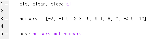 자, 그러면 매트랩에서 하나의 .mat 파일을 생성한 후, 그것을 파이썬에서 읽어보는 것을 함께 해보도록 하겠습니다. 먼저 저는 example.m이라는 이름의 매트랩 스크립트 파일을 만들어서 다음과 같은 코드를 적었습니다. -2, -1.5, 2.3 등의 실수들을 배열의 형태로 numbers라는 변수에 담은 후 numbers.mat이라는 파일에 저장한 것입니다.