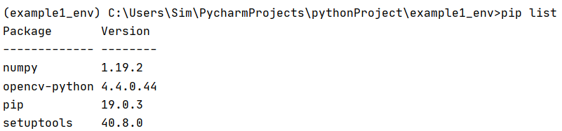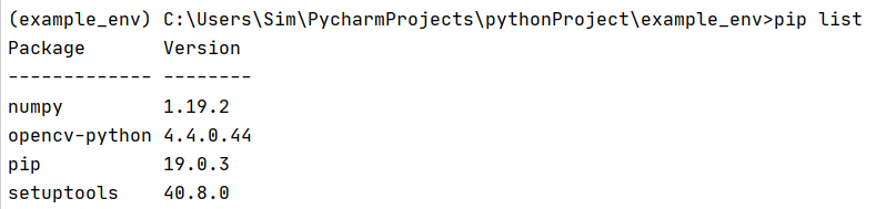 잘 설치되었고요. example_env 가상환경 내에 설치된 패키지 목록에 변화가 생겼는지 pip list로 확인해보겠습니다.