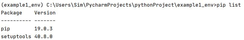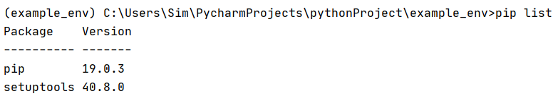 가상환경이 활성화되었습니다. 앞에 (example_env)라는 표시가 생겼죠? example_env라는 가상환경에 들어왔다는 뜻입니다. 그러면 다시 pip list를 명령해보겠습니다.