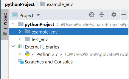이렇게 명령하면, example_env라는 이름의 하위 디렉토리가 생성됩니다. 가상환경이 생성되었다는 뜻입니다.