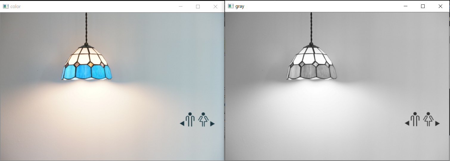 그러면 위 파이썬 스크립트를 실행시키겠습니다. 그러면 다음과 같이 컬러 이미지와 그레이 스케일 이미지가 보여질 것입니다. 잘 되셨나요?