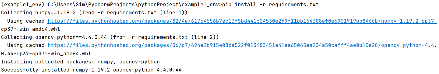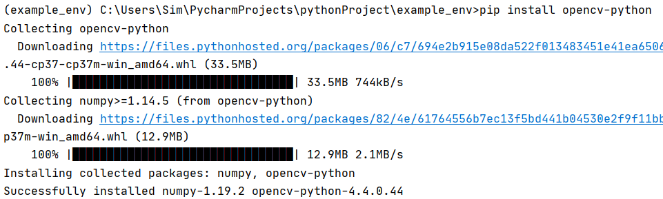 opencv-python을 설치했는데 numpy 패키지도 함께 설치된 것을 확인할 수 있습니다. 왜냐하면 opencv-python 패키지는 numpy 패키지를 필요로 하기 때문입니다. 그래서 저절로 함께 설치된 것입니다. 이와 같이 어떤 패키지를 설치하다보면 동시에 그 패키지를 실행하기 위해 필요한 여러 다른 패키지들도 설치되곤 합니다.