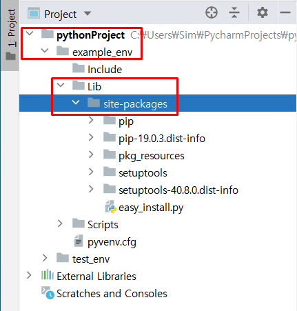 그러면 새롭게 만든 가상환경에는 어떤 패키지들이 설치되어 있을까요? 그것을 확인하시려면 example_env 디렉토리에 들어가서 Lib -> site-packages를 확인하시면 됩니다.
