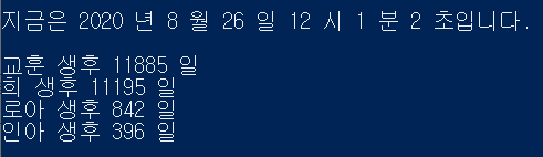 이 코드를 실행하면 다음과 같이 생후 몇 일되었는지를 알 수 있습니다. 태어난 시간은 그냥 0시 0분 0초로 설정했습니다. 우리는 날 수만 계산하면 되기 때문입니다.