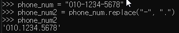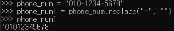 전화번호문자열.replace("-", "")