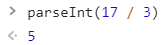 우선 몫을 구하는 방법은 다음과 같습니다. 17 / 3으로 나온 실수를 parseInt() 함수에 넣어줘서 정수부분만 취하는 것입니다.
