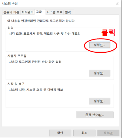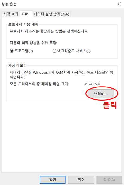 여기서 성능의 설정을 클릭합니다. 그 다음에 성능 옵션에서 고급으로 들어가면 다음과 같은 화면이 뜹니다.
