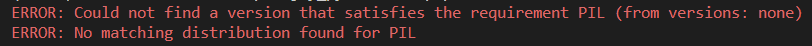이 경우에는 PIL이라는 모듈이 없다는 뜻입니다. 이런 메시지가 떴을 때 보통 우리는 관습적으로 다음과 같이 설치를 시도해보곤 합니다.