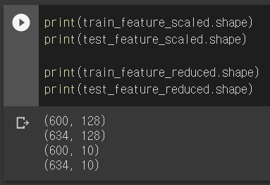 차원축소가 잘 이뤄졌네요.^^ 128개 였던 훈련 특성과 테스트 특성이 각각 10개로 줄어들었습니다.