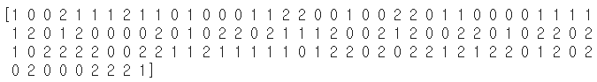 0, 1, 2의 숫자들로 이루어진 것을 확인할 수 있습니다. 여기서 0, 1, 2는 각각 setosa, versicolour, virginica라는 이름의 품종을 지칭합니다. 식물학자가 아닌 이상 알 필요 없으니 굳이 검색해보지 마세요.^^
