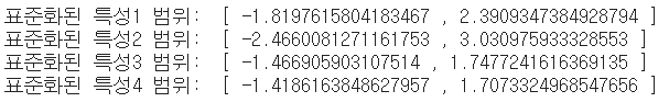 print("표준화된 특성4 범위: ", "[", min(X_train_std[:, 3]), ",", max(X_train_std[:, 3]), "]")