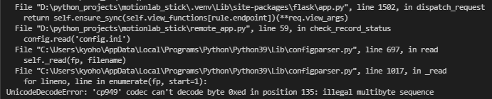 위 에러는 파이썬에서 configparser 모듈을 이용해서 config.ini와 같은 파일을 읽을 때 발생할 수 있는 에러입니다. cp949는 한글 인코딩 방식의 하나인데 파이썬에서는 이걸로 인코딩된 한글은 제대로 못 읽어냅니다.