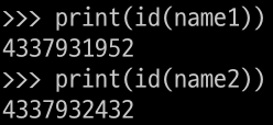 name1 변수에 "심교훈"이라는 문자열을 담았고, name2 변수에도 "심교훈"이라는 문자열을 바인딩 했습니다. == 연산자로 이 둘을 비교해보니 True를 반환해줬습니다. 반면 is 연산자로 비교했을 때는 False를 반환해줍니다. 왜 그런지 이유를 살펴보겠습니다. id 함수로 두 변수에 바인딩되어 있는 값의 주소를 확인해보면 서로 다릅니다. 그렇기 때문에 is 연산자로는 False가 반환된 것입니다.