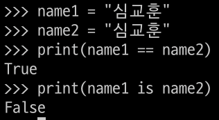 이번에는 name1에 "심교훈"이라는 값을 바인딩 하고, name2 변수에는 name1 변수를 바인딩해주겠습니다. 그 다음에 ==, is 연산자로 비교해보겠습니다.