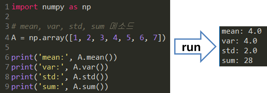 min 메소드와 argmin 메소드는 max 메소드와 argmax 메소드와 사용법에 있어 상통하므로 예제는 생략하겠습니다.
