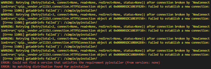 WARNING: Retrying (Retry(total=3, connect=None, read=None, redirect=None, status=None)) after connection broken by 'NewConnectionError('<pip._vendor.urllib3.connection.HTTPSConnection object at 0x000001DC10B3FE50>: Failed to establish a new connection: [Errno 11001] getaddrinfo failed')': /simple/pyinstaller/