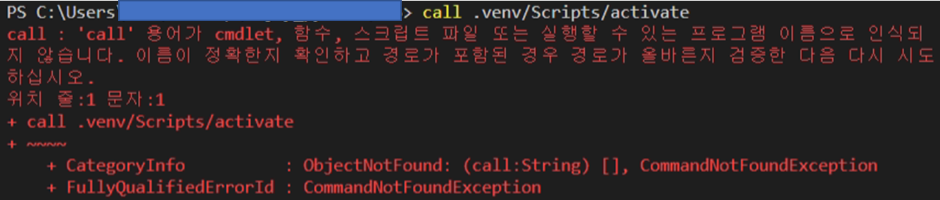 call : 'call' 용어가 cmdlet, 함수, 스크립트 파일 또는 실행할 수 있는 프로그램 이름으로 인식되지 않습니다. 이름이 정확한지 확인하고 경로가 포함된 경우 경로가 올바