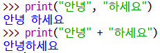 print 함수에서 어떤 값들을 이을 때 사용할 수 있는 대표적인 방법은 콤마(,)를 사용하는 것과 덧셈(+)을 사용하는 방법이 있습니다. 둘 다 아주 많이 사용하는 방법이죠. 그런데 큰 차이가 있습니다.