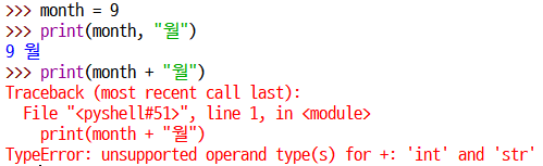 덧셈(+)으로 정수와 문자열을 연결하려고 했더니 보시는 것과 같이 에러가 떴습니다.